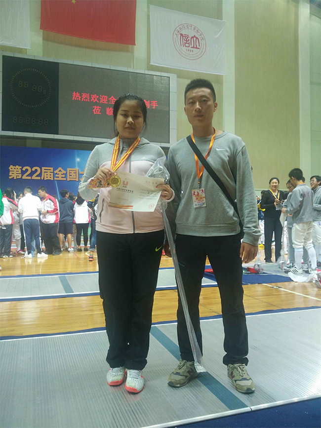 我院代表队由体育教研室主任许振刚作为领队,李阳为教练员,从新成立的体育俱乐部中培训并选拔出李逸佳同学参加比赛。李逸佳一鼓作气,首战告捷,以小组第三的好成绩闯入决赛,经过几天激烈的角逐后,最终获得女子重剑个人赛(甲组)冠军。