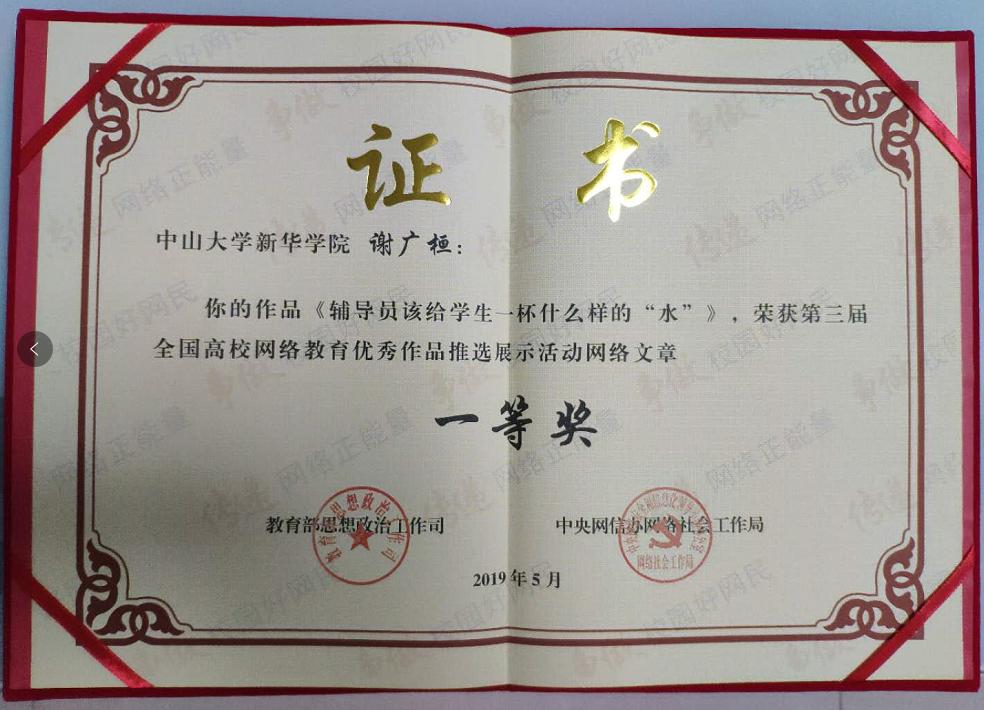 由教育部思想政治工作司、中央网信办网络社会工作局主办的第三届全国高校网络宣传思想教育优秀作品推选展示遴选结果已公布,kaiyun官网法学院谢广桓老师撰写的网络文章《辅导员该给学生一杯什么样的“水”》荣获网络文章一等奖。