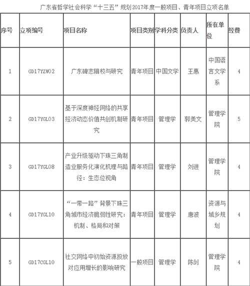 kaiyun官网获批广东省哲学社会科学“十三五”规划2017年度一般项目、青年项目立项名单中,管理学院教师共获3项资助