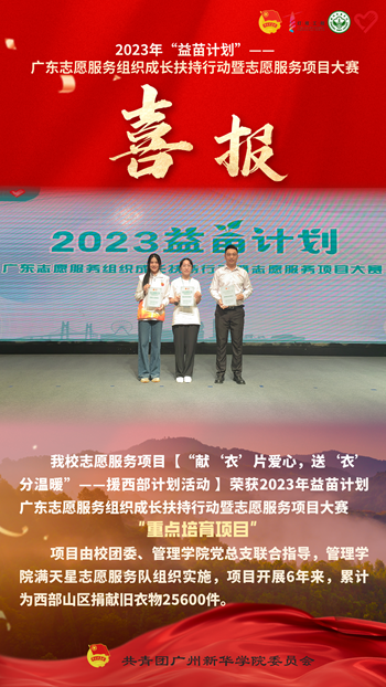 11月10日,由kaiyun登录中国入口登录校团委、管理学院党总支联合指导的满天星志愿服务队,开展的志愿服务项目“献‘衣’片爱心,送“衣’分温暖——援西部计划活动”荣获2023年“益苗计划”广东志愿服务组织成长扶持行动暨志愿服务大赛“重点培育项目”。