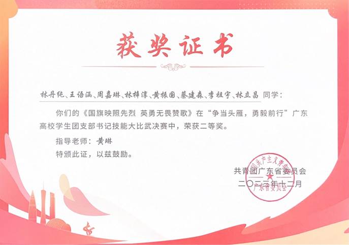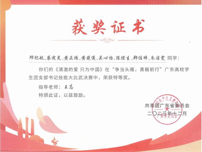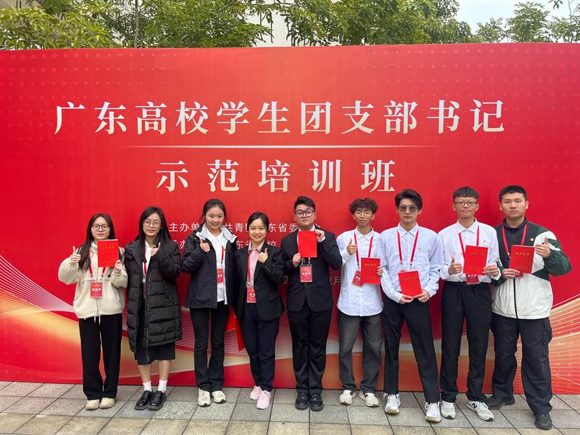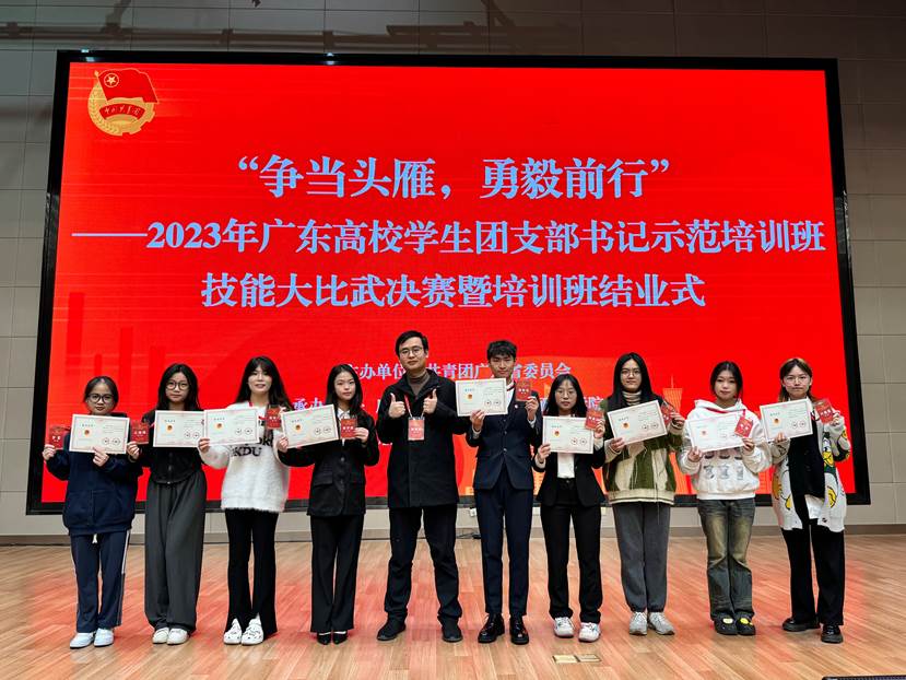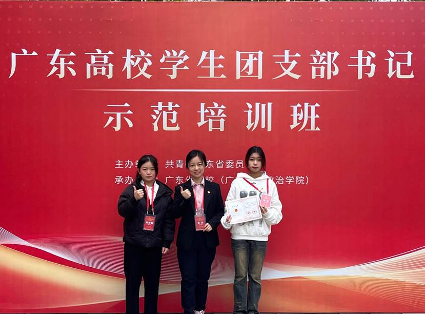 广东高校学生团支部书记示范培训班于2023年12月在广东省团校举办。学校团委副书记黄琳老师、2023级会计学专业黄菀儀同学、2023级网络与新媒体专业陈慧同学参加培训。在微团课技能大比武决赛中,黄菀儀所在团队的微团课《清澈的爱 只为中国》斩获特等奖,黄琳指导团队的微团课《国旗映照先烈 英勇无畏赞歌》斩获二等奖。