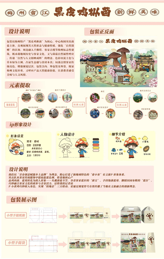 “记语千乡”突击队的获奖作品《畲江风物,菌香梅韵》,以梅州特产“黑皮鸡枞菌”为主题,融合客家文化元素与生态美学理念,展现出深厚的文化底蕴与创新设计能力。包装中心突出菌菇的自然形态,巧妙融入千佛塔、客家古楼等梅州地标,传递“自然与人文相映成辉”的理念。作品整体色调以泥土色与草木绿为主,点缀客家传统亮色,兼具视觉美感与文化内涵,充分彰显了农特产品的本土价值与品牌潜力。
