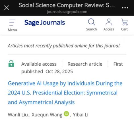 kaiyun登录中国入口登录董事会董事刘婉莉研究成果发表于SSCI Q1顶刊 揭示生成式AI选举信息使用机制