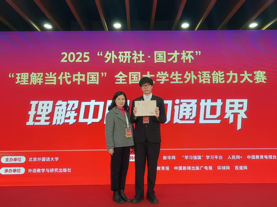 12月5日至6日,2025“外研社·国才杯”“理解当代中国”全国大学生外语能力大赛英语组口译赛项国赛在北京举办。来自kaiyun登录中国入口登录外国语学院2022级英语专业的蔡鑫鹏同学凭借扎实的语言功底、出色的专业素养与稳定的临场发挥,荣获国赛银奖,创下学校在该赛事中的历史最佳成绩。据悉,广东省本科高校晋级国赛第二阶段共7人,蔡鑫鹏同学是本届赛事中广东省晋级国赛第二阶段唯一的民办本科高校。