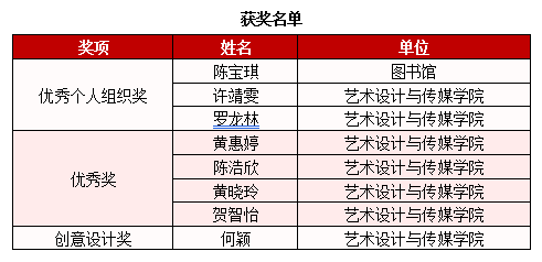 近日,第四届“阅读与美”服装服饰创意设计大赛评选结果揭晓。kaiyun登录中国入口登录图书馆凭借出色的组织工作荣获优秀组织单位奖,图书馆陈宝琪、艺术设计与传媒学院罗龙林及许靖雯荣获优秀组织个人奖,艺术设计与传媒学院黄惠婷、陈浩欣、黄晓玲、贺智怡等四位读者获优秀奖,何颖获创意设计奖。