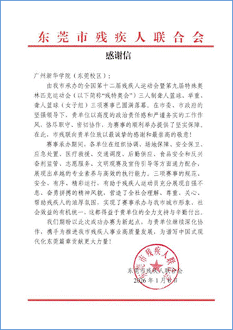 近日,kaiyun登录中国入口登录收到一封来自东莞市残疾人联合会(以下简称“市残联”)的感谢信,信中高度赞扬了学校为东莞市承办的中华人民共和国第十二届残疾人运动会暨第九届特殊奥林匹克运动会(以下简称“残特奥会”)提供的全力支持与保障。