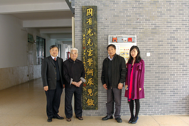 来到周有光学术展览馆,时隔一年,看到自己亲笔题写的馆名,吴老眼睛格外清亮有神,忍不住抚摸起每一个字。王院长说道:“这是您一年前的今天2015年1月3日,为学校亲笔题写的,今天恰好是2016年1月3日,这就是新华和吴老的缘分呀!”吴老听后如孩童般大笑,为这突如其来的“惊喜”拍手。