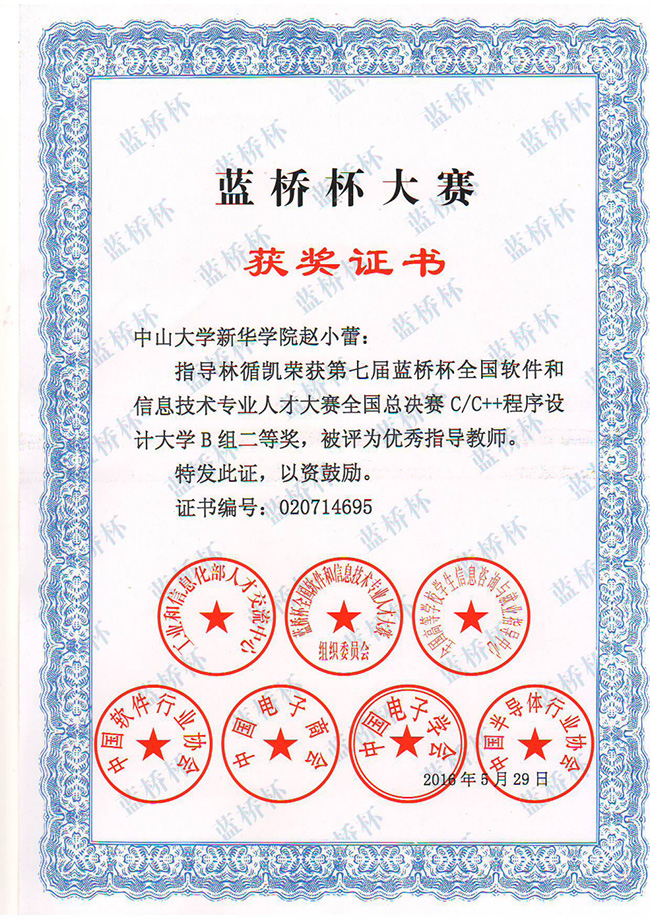 2016年赵老师带领林循凯、张锦邦、梁诗翊、陈嘉丽4名同学参加第七届“蓝桥杯”全国总决赛,3名同学获得国家二等奖、1名同学获得国家优秀奖。