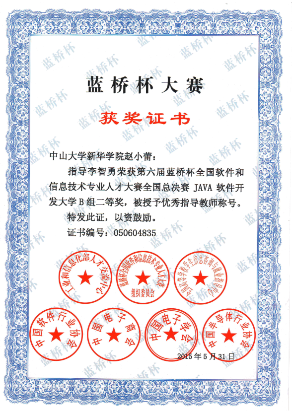 2015年,赵老师带队参加第六届“蓝桥杯”全国软件和信息技术专业人才大赛全国总决赛,2名同学获得国家二等奖。
