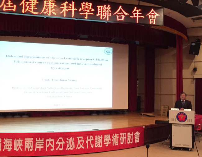 中山大学新华学院院长、中山大学医学部副主任、国家万人计划教学名师王庭槐教授作为首届海峡两岸内分泌及代谢学术研讨会第一副主任委员赴台出席了此次研讨会,并在会上作了以《雌激素受体GPR30在雌激素促进ER阴性乳腺癌细胞MDA-MB-231迁移和侵袭过程中的作用及机制》为题的学术报告。