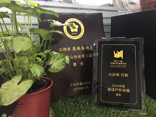 越努力越幸运,当被问到行影迄今所获得的奖项时,蔡腾昌言语中洋溢着满满自豪感。行影曾获第十一届中国户外金犀牛奖2016年度最佳户外传播提名(金犀牛奖是中国最具权威、专业、全面的一项户外评选活动);CCTV、广东卫视电视台、广东交通广播电视台、户外届的杂志《户外探险》等相关媒体相继前来采访蔡腾昌;广州市登山协会聘请他为委员,户外经理人和户外联盟都聘请蔡腾昌以讲师身份去分享运营的方法、经验。