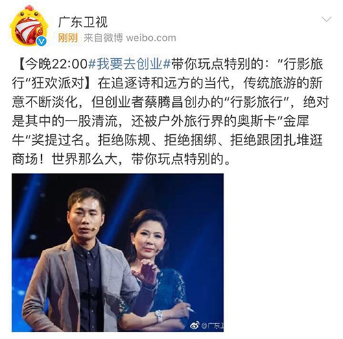 2015年,蔡腾昌成立了行影文化活动策划公司,这是一个专注于青年创意旅行的大学生团队,策划了义工旅行、户外拓展、行影青旅、攀岩徒步、露营骑行等创意旅行项目。