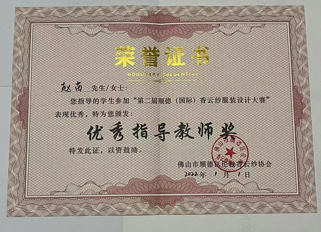 参加教学工作以来,赵苗始终坚守教学前线,坚持创新奋进,提升自身教学能力,引导学生以赛促学,先后获得2021“裘都杯”中国裘皮服装创意设计大赛、第二届顺德(国际)香云纱服装设计大赛、KNIT FOR NEXT 2022针织新锐设计师大赛等多项赛事的“优秀指导老师”奖。