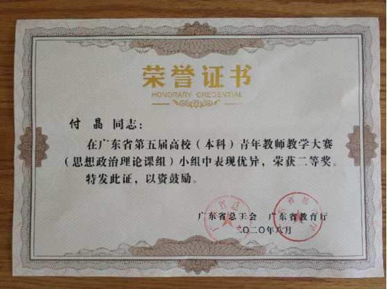 付晶荣获广东省第五届高校(本科)青年教师教学大赛(思想政治课组)二等奖