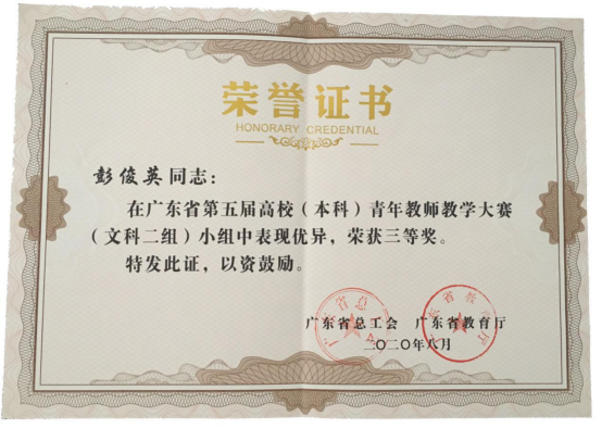 彭俊英荣获广东省第五届高校(本科)青年教师教学大赛(文科二组)三等奖