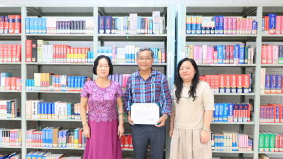 康星华副教授(中)与图书馆副馆长钟伟珍(左)、图书馆办公室主任谢缓蔚(右)合影