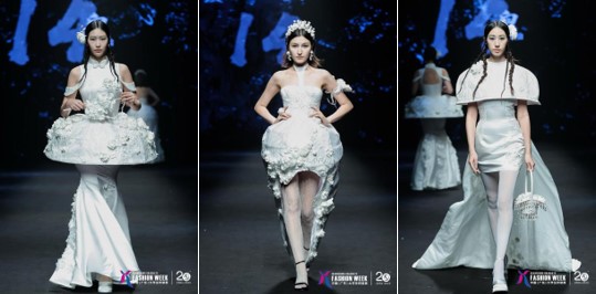 元素融合方面,植入新中式立领、对襟盘扣、中式斗篷等传统服饰元素,结合白瓷的素净釉面质感,通过镂空、层叠、拼接等手法,在领口、袖口、下摆处形成“瓷胎”与“织物”的虚实对比。